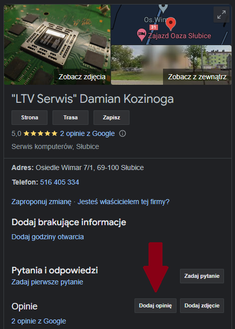 - Na wyświetlonej stronie, wizytówce po prawej stronie, kliknij: Dodaj Opinie.